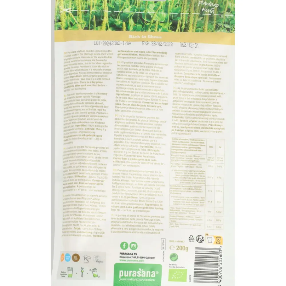 Purasana Vegan Psyllium Poeder is 100% biologische psyllium afkomstig uit India en is ideaal om de vezelinname te verhogen. Deze psylliumvezels bevatten twee typen vezels, namelijk wel en niet oplosbare. De niet oplosbare vezel zorgt voor de buik en kan voor een regelmatige stoelgang zorgen en de wel oplosbare vezel absorbeert water, gif- en afvalstoffen en kan ervoor zorgen dat voedingsstoffen beter kunnen worden opgenomen.