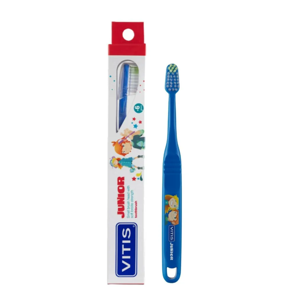 De Vitis Junior Tandenborstel is geschikt voor dagelijkse mondhygiëne voor kinderen van 6 jaar en ouder. De kindvriendelijke tandenborstel heeft een kleine borstelkop en smalle hals waarmee alle delen van de mond zeer goed te bereiken zijn. Dankzij de speciale monotip borstelkop wordt zelfs de meest resistente bacteriële plaque moeiteloos verwijderd. Het ergonomische handvat van de Vitis Junior Tandenborstel, met antislipgroeven, past op deze leeftijd perfect in de hand van kinderen. De Vitis Junior Tandenborstel wordt geleverd met een doorzichtig plastic beschermkapje die de haartjes netjes en in optimale hygiënische staat houdt, terwijl de haartjes snel kunnen drogen