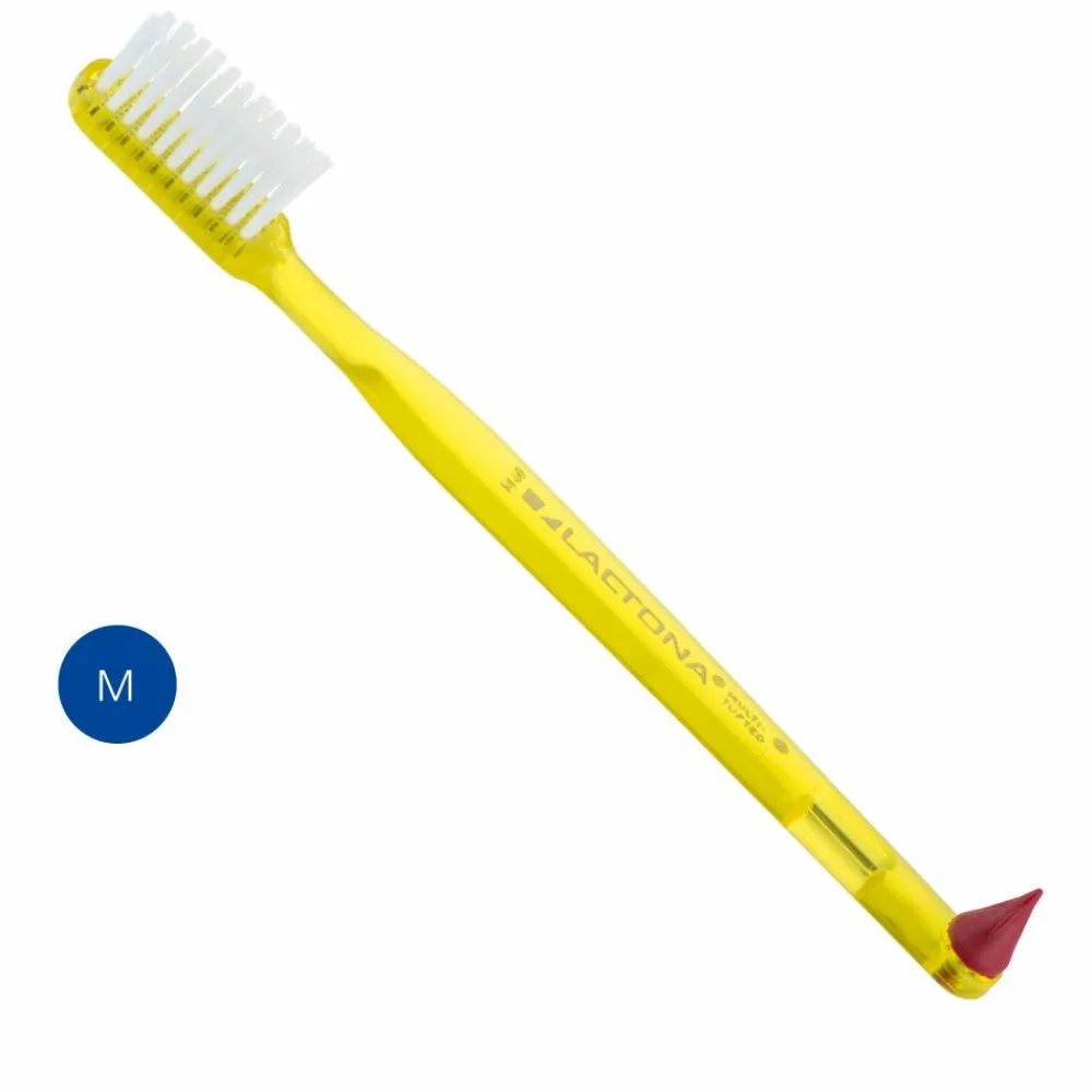 Deze Lactona tandenborstel heeft een mooi slank design met een goede duimgrip. Door deze duimgrip ligt deze tandenborstel goed in de hand en kun je gecontroleerd het gebit poetsen. De borstelkop bevat 4 rijen met medium borstelharen, hierdoor blijft de borstelkop smal en kun je makkelijk de moeilijk bereikbare plekken in de mond poetsen. Door de medium borstelharen is deze borstel uitermate geschikt voor mensen met een beugel.