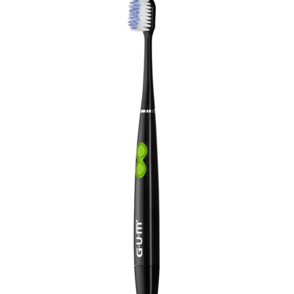 De GUM ActiVital Elektrische tandenborstel Black is een sonische tandenbostel die op batterijen werkt. Deze zwarte tandenborstel maakt door middel van 12.000 bewegingen per minuut op milde wijze de tanden en kiezen schoon. De trilkracht zorgt voor een betere reiniging dan een normale handtandenborstel. De borstelharen zijn taps toelopend en zijn daar door 50% effectiever in het bereiken van de ruimtes tussen de tanden en kiezen. Er word dieper onder de tandvleesrand gereinigd en het tandvlees word gestimuleerd.