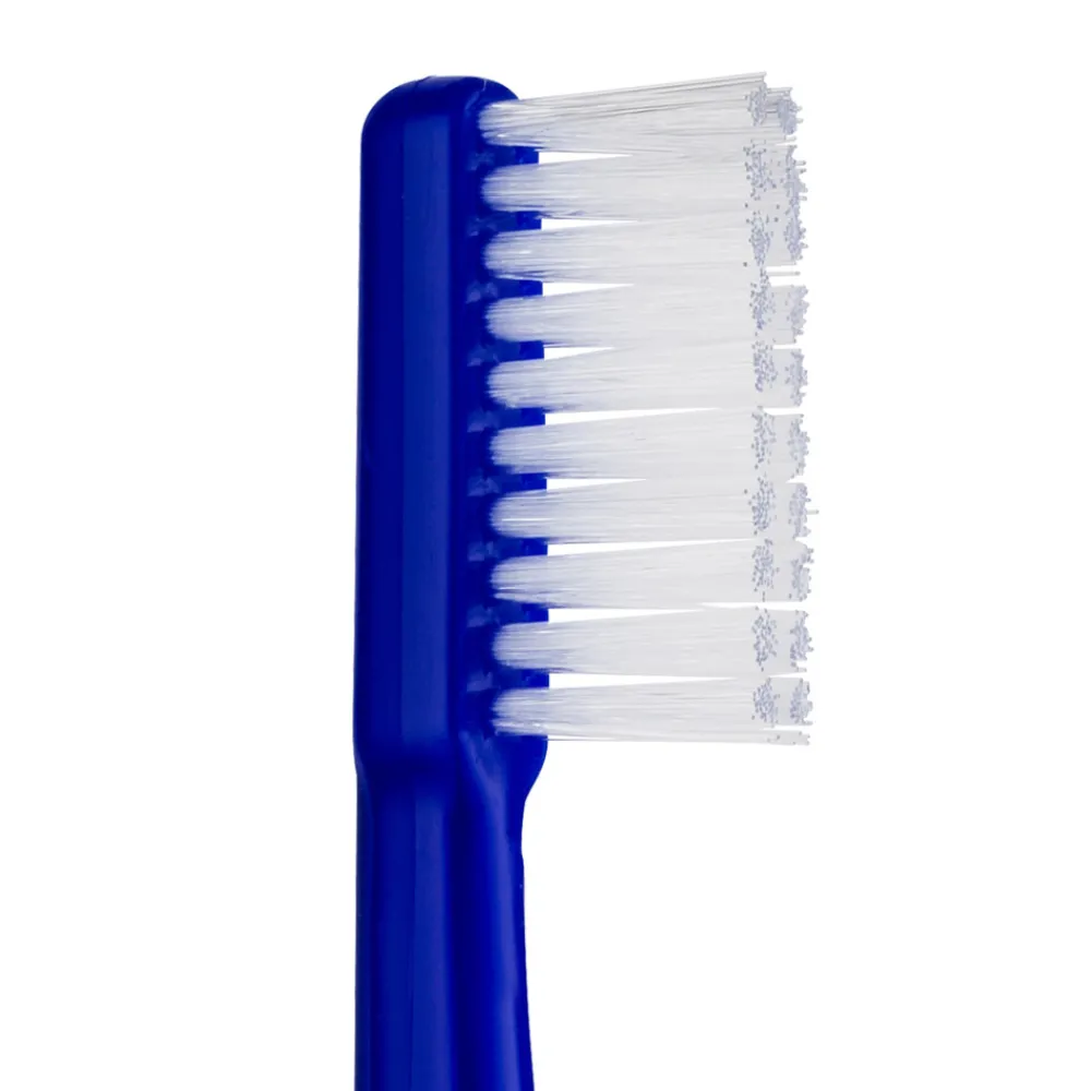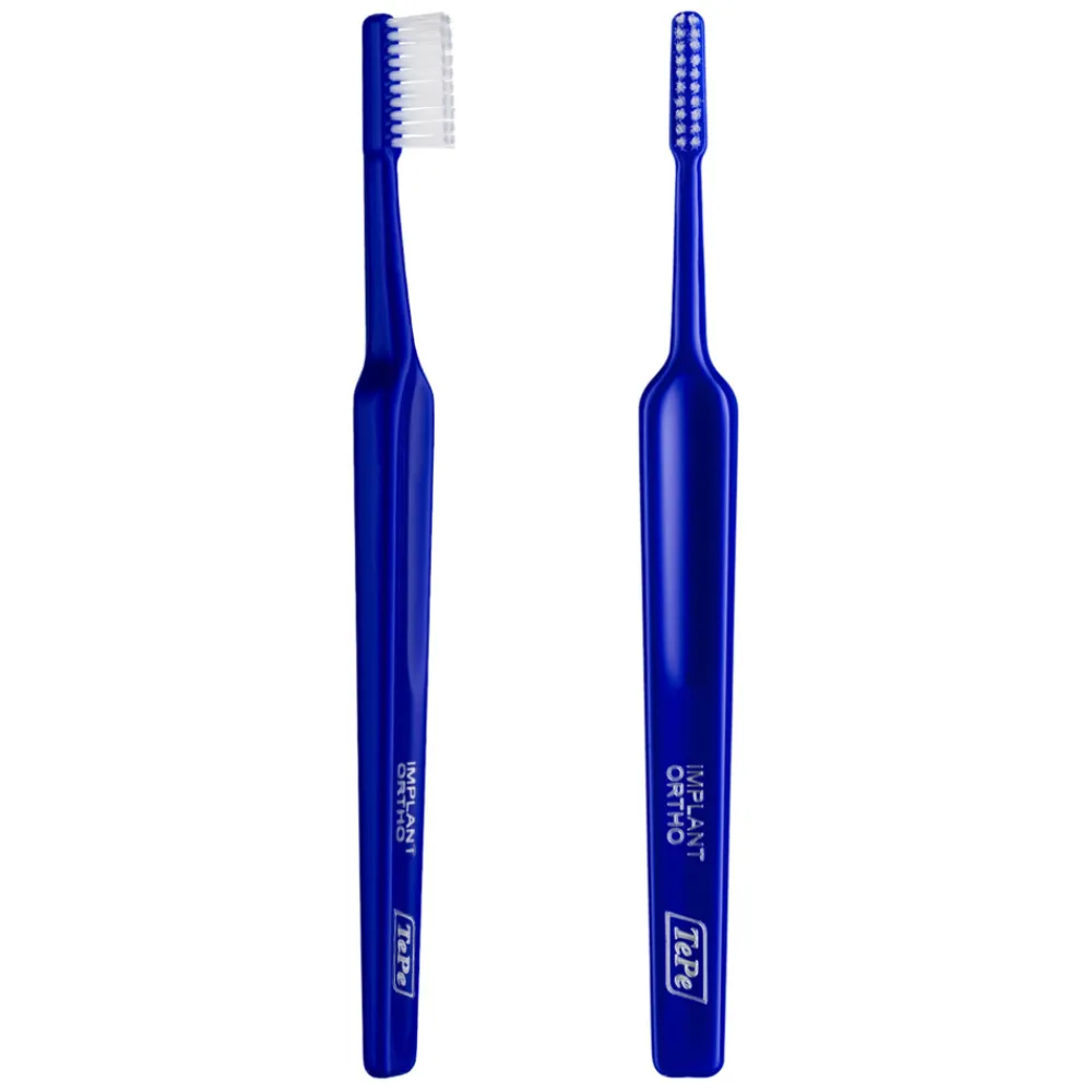De TePe Implantaat/Orthodontieborstel heeft zachte borstelharen in twee rijen, een extra smalle borstelkop en een lange, dunne hals. Dit maakt nauwkeurige reiniging van moeilijk bereikbare plekken door implantaten en orthodontische apparaten mogelijk. Deze tandenborstel is geschikt voor het reinigen langs de tandvleesrand, op implantaatconstructies en boven(op) vaste beugels.