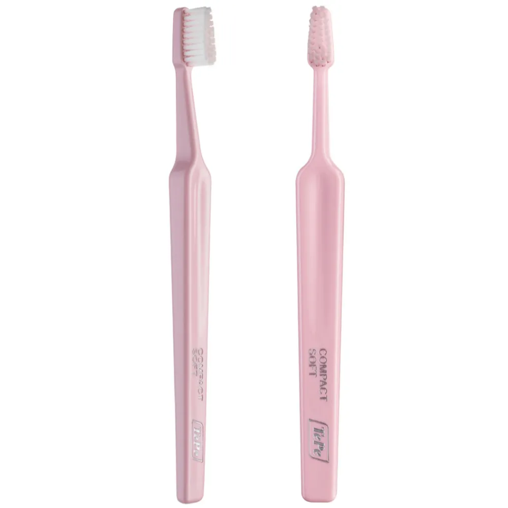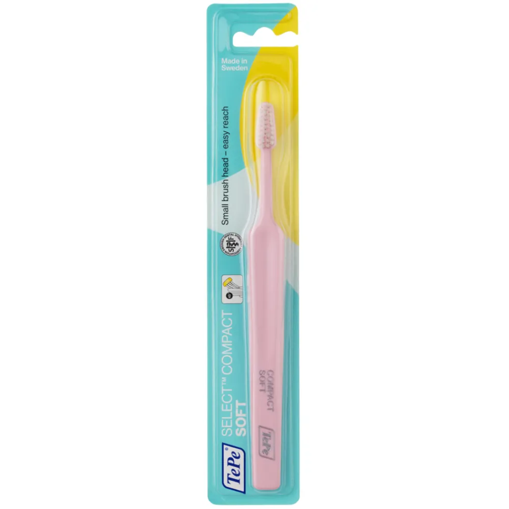 De TePe Select Compact Soft is een voordelige, gebruiksvriendelijke tandenborstel van TePe, ontwikkeld in samenwerking met tandheelkundige experts voor een goede en zachte tandplakverwijdering. De taps toelopende borstelkop verbetert de toegang tot de mond en de afgeronde borstelharen zorgen voor een zachte reiniging. De hals van TePe Select kan worden gebogen nadat deze verwarmd is onder heet water.