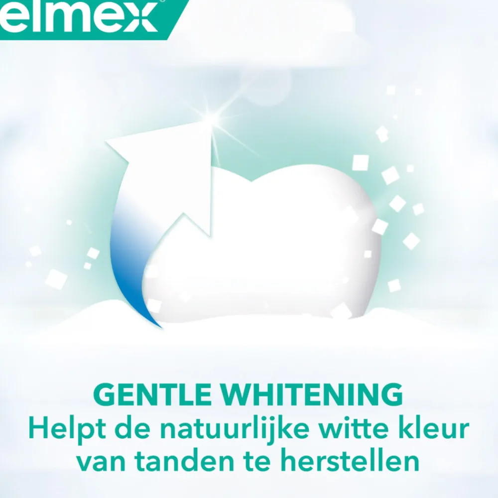 De nieuwe Elmex Sensitive Tandpasta Whitening heeft een geavanceerde technologie voor een proactieve bescherming van je hele mond. Werkt tegen bacteriën, niet alleen op de tanden, maar ook op de tong, de wangen en het tandvlees, en dat 12 uur lang*. *na 4 weken van continu gebruik, klinische studie.