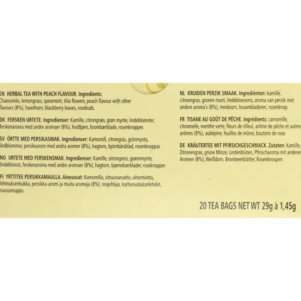 Ingrediënten Kamille (48%), citroengras, groene munt, lindebloesems, natuurlijk aroma van perzik met andere natuurlijke aroma’s (8%), meidoorn, braamblad, oranjebloesems en rozenknop.