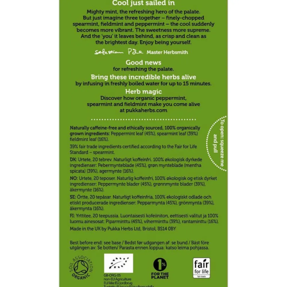 Intens geurend en opwekkend. Zuiver en eerlijk. De Pukka theeën zijn gebaseerd op de helende kracht van de aloude Ayurvedische leer van evenwicht en harmonie. Alle ingrediënten zijn biologisch en ethisch verantwoord geproduceerd. Voor ieder moment en elke stemming of behoefte is er een theevariant. Een pure prikkeling van de smaakpapillen. Dát is munt. Deze Pukka Three Mint thee combineert pepermunt, groene munt en akkermunt. Een heerlijk levendige en opwekkende thee met een knisperend frisse en volle smaak.