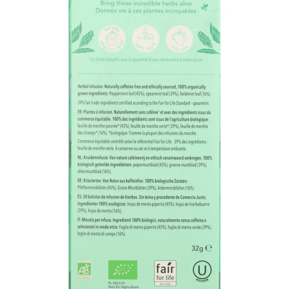 Pukka streeft ernaar positieve verandering te brengen op de wereld – voor jou, de natuur en alles daar tussenin. Pukka Three Mint is een blend met pepermunt, groene munt en veldmunt. Gemaakt van 100% biologische ingrediënten die duurzaam verbouwd zijn. Breng deze heerlijke kruiden tot leven door ze tot 15 minuten in vers gekookt water te laten trekken.