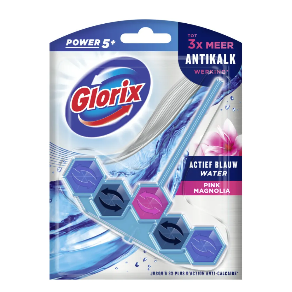 Glorix Power 5+ Actief Blauw Water Pink Magnolia Wc Blok voor een hygiënisch schoon en langdurig fris toilet. Het product heeft diverse voordelen! Het toiletblokje geeft elke spoelbeurt de kracht van nieuwe Glorix Power 5+! Het reinigende schuim met 3x meer antikalk-werking* zorgt voor glans en een hygiënische reiniging. De langdurige werking van het Pink Magnolia-parfum houdt je toilet lang fris. Bovendien blijft het water in het toilet langer blauw. Glorix Power 5+ voor een intens hygiënische reiniging. Met Glorix is je hele toilet écht schoon en hygiënisch fris! Gebruik in combinatie met de andere reinigingsproducten van Glorix voor een optimaal resultaat.