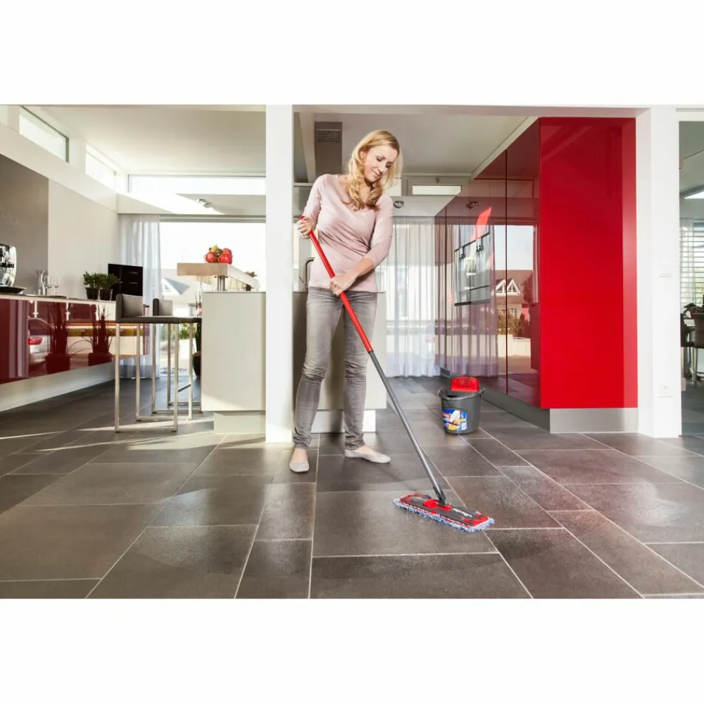 De complete kit UltraMax Microfibre & Cotton van Vileda is ideaal om tegelvloeren grondig en tot in de voegen schoon te maken.De kit bestaat uit een emmer met pers en een mop met dikke, flexibele schuurlussen om de tegels en de voegen nog grondiger te reinigen.