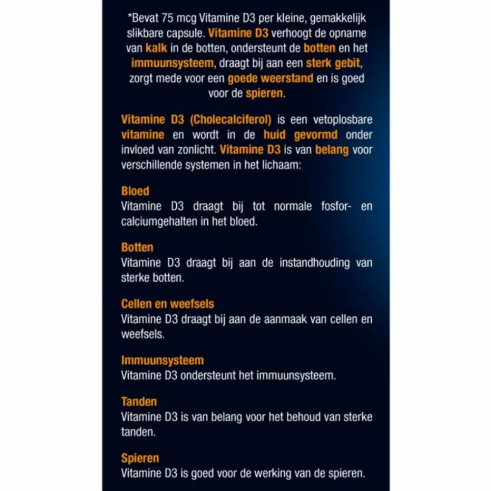 Vitamine D3 (Cholecalciferol) is een vetoplosbare vitamine en wordt in de huid gevormd onder invloed van zonlicht.