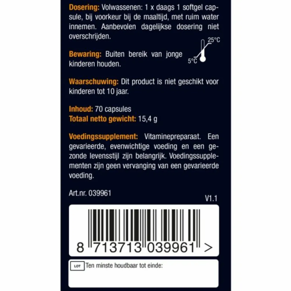 Eenmaal daags 1 softgel capsule bij voorkeur bij een maaltijd innemen. Dagelijkse dosering niet overschrijden.