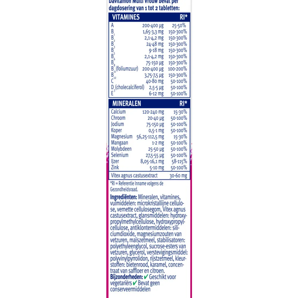 Davitamon Multi voor de vrouw Speciaal voor vrouwen is speciaal ontwikkelt voor de behoefte van de vrouw. De samenstelling is zorgvuldig geselecteerd en een complete aanvulling op gezonde voeding. De multi vitamine ondersteunt het vrouwelijk lichaam op verschillende gebieden. De multi bevat vitaminen, mineralen en het natuurlijke extract Vitex agnus castus. De samenstelling is zorgvuldig geselecteerd en afgestemd op de specifieke behoeften van vrouwen.