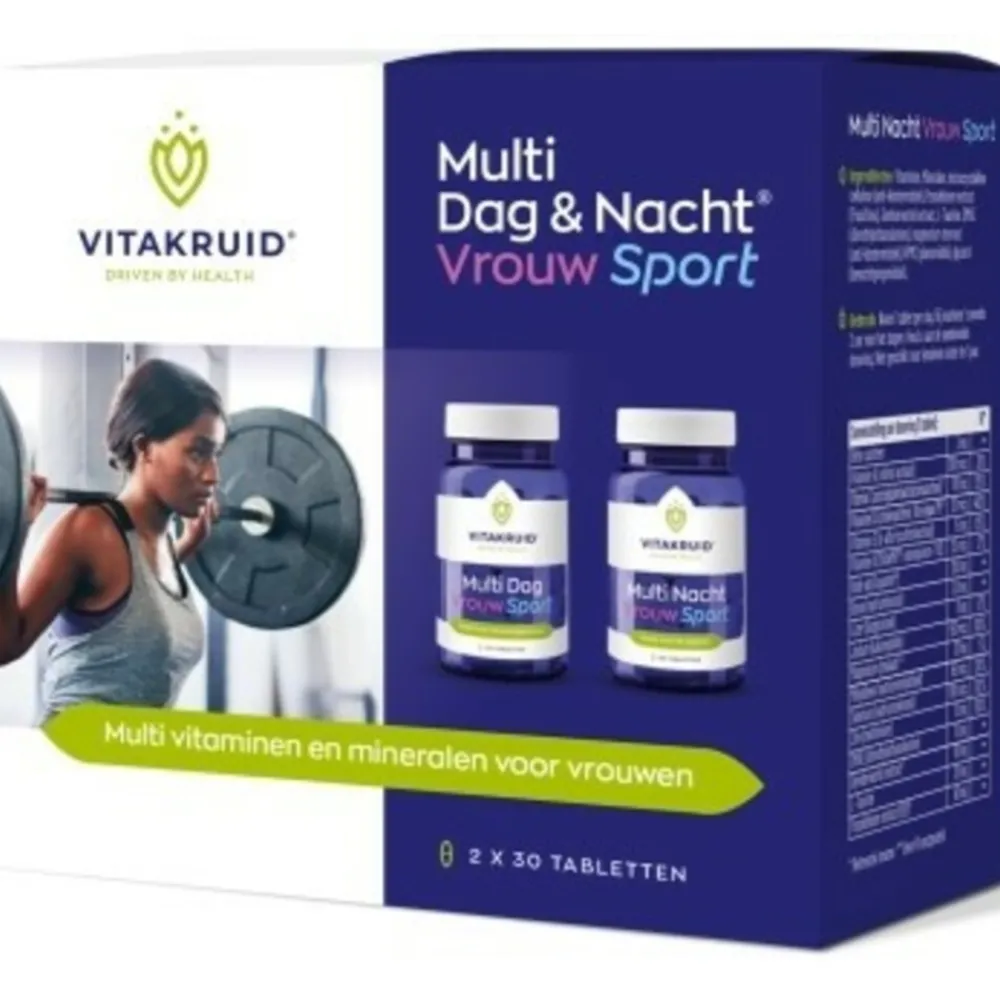 Vitakruid Vrouw Sport Multi Dag Nacht is een pakket van 2x 30 tabletten special afgestemd op de behoeften van een vrouw.