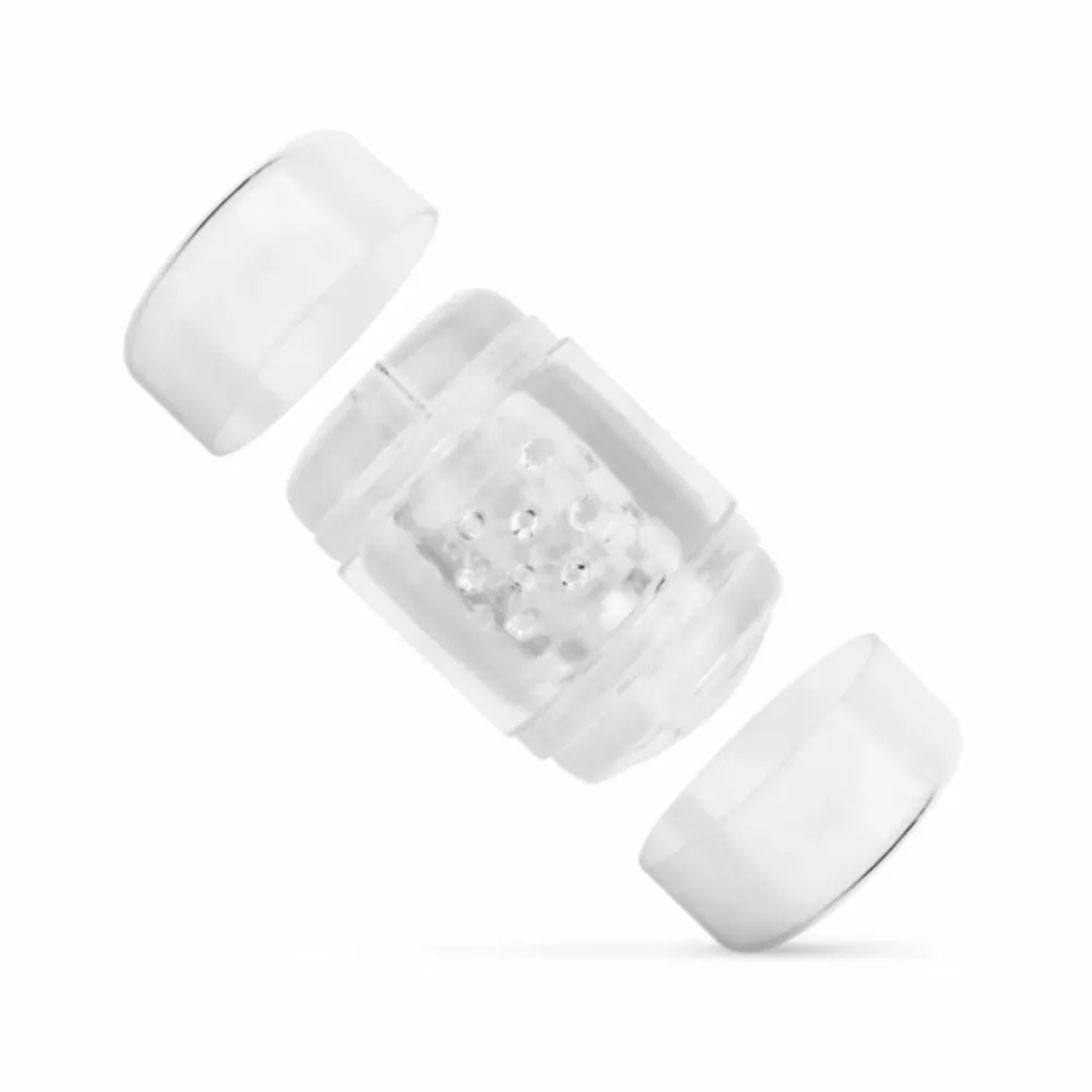 Geniet van een intense penis stimulatie met deze transparante dubbelzijdige masturbator. Deze masturbator heeft een vaginale en anale opening, een rekbaar en flexibele sleeve en een stimulerende geribbelde binnenkant. Doordat de masturbator transparant is kan je alles zien, wat de ervaring extra opwindend maakt. Dankzij het compacte formaat kan je deze masturbator makkelijk meenemen. Verwijder de sleeve na gebruik uit de casing en maak het grondig schoon met water en toycleaner of een milde antibacteriële zeep.