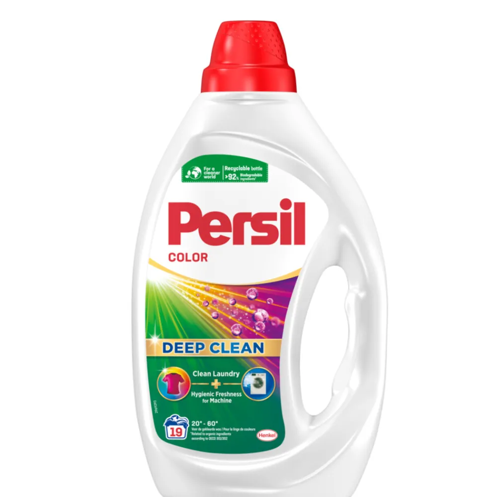 Ontdek Persil Color Gel voor een perfect schone was en een hygiënisch frisse wasmachine!De krachtige formule van Persil Color Gel dringt diep door in de vezels zonder ze te beschadigen en verwijdert zelfs de meest hardnekkige vlekken. De Color Gel beschermt kleding tegen vergrijzing, zodat gekleurd wasgoed bij elke wasbeurt helder blijft. Daarnaast werkt de nieuwe, verbeterde formule ook diep in de wasmachine en bestrijdt onaangename geurtjes in je wasmachine. Alleen een hygiënisch frisse wasmachine zorgt voor perfect schoon wasgoed! Onze Persil Deep Clean Gel biedt uitstekende reinigingsprestaties met een verbeterde duurzaamheid van de fles, die 50% gerecycled plastic bevat.