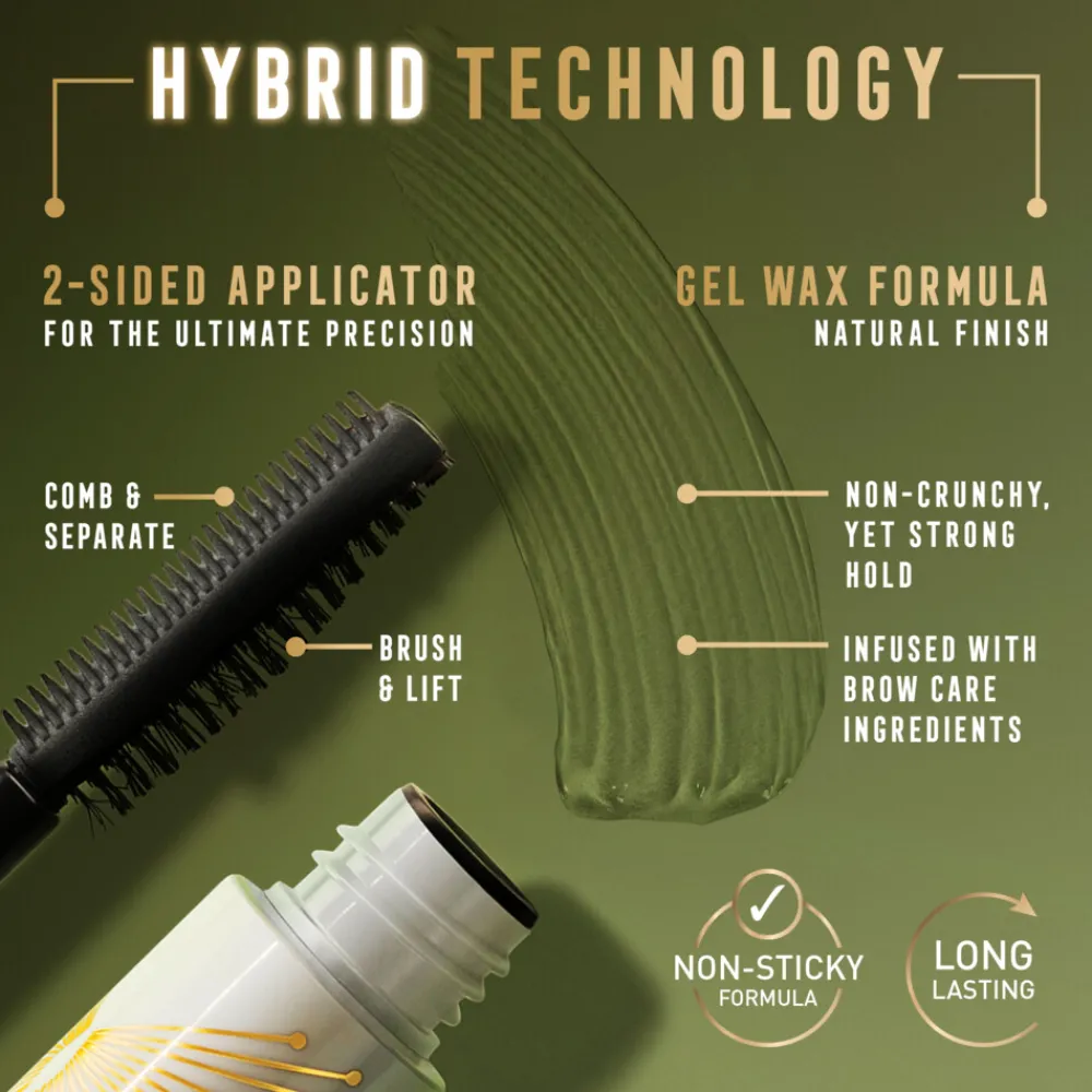 - Gel/wax, langhoudende formule die de wenkbrauwen goed fixeert zonder hard aan te voelen.