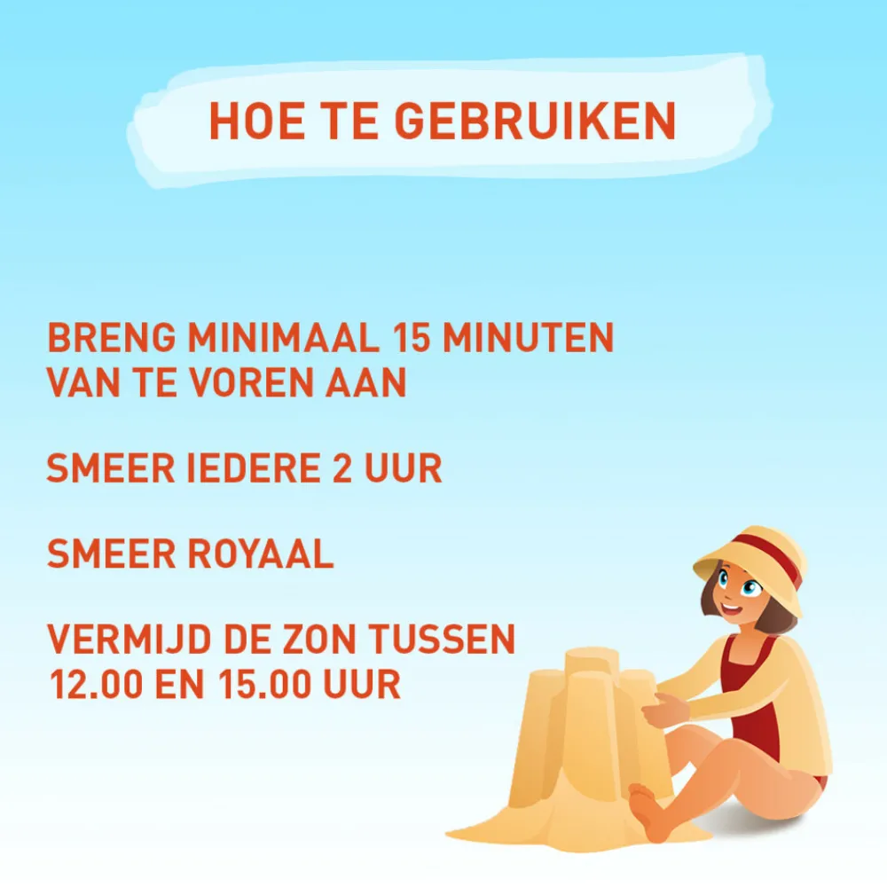 15-20 minuten voor blootstelling aan de zon royaal aanbrengen. Regelamtig (om de 2 uur) opnieuw aanbrengen, vooral na zwemmen, afdrogen of transpireren. De gekleurde zonnelotion maakt het insmeren tot een waar insmeerfestijn. Wanneer de kleur verdwenen is, is de lotion goed uitgesmeerd.