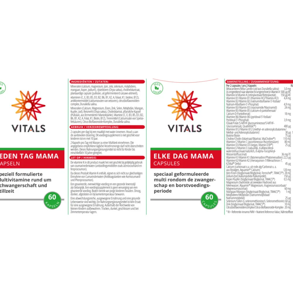 Vitals Elke Dag Mama is ontworpen voor vrouwen die de voorkeur geven aan capsules in plaats van tabletten. Elke Dag Mama Capsules bevat per twee capsules precies dezelfde doseringen als het product Elke Dag Mama Tabletten, met uitzondering van choline (110 mg i.p.v. 150 mg), vitamine C (80 mg i.p.v. 200 mg), calcium (120 mg i.p.v. 200 mg) en magnesium (60 mg i.p.v. 100 mg). Deze zijn in de capsules lager gedoseerd, simpelweg omdat er meer past in een tablet dan in twee capsules. Het product is samengesteld op basis van de meest recente wetenschappelijke inzichten, afgestemd op actuele gegevens aangaande de voedingsstatus in Nederland en de optimale innamehoeveelheden per nutriënt.